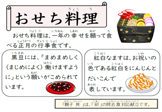 今日の献立は、親子丼、紅白なます、黒豆の煮もの、牛乳です。