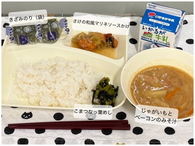 今日の献立は、こまつなっ葉 めし、さけの和風 マリネソースかけ、じゃがいもとベーコンのみそ汁 、牛乳です。