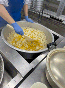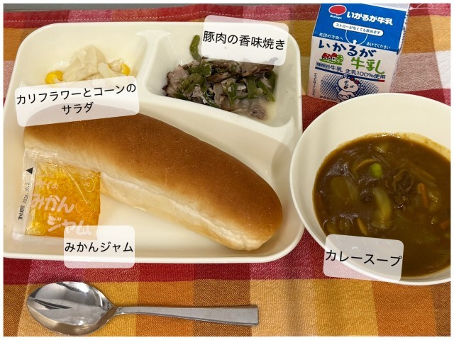 今日の献立は、豚肉の香味焼き、カレースープ、カリフラワーとコーンのサラダ、コッペパン、みかんジャム、牛乳です。