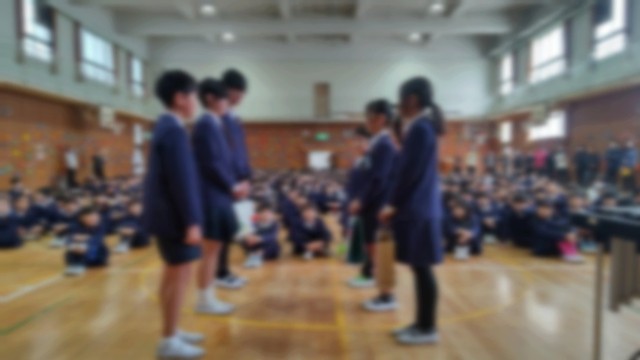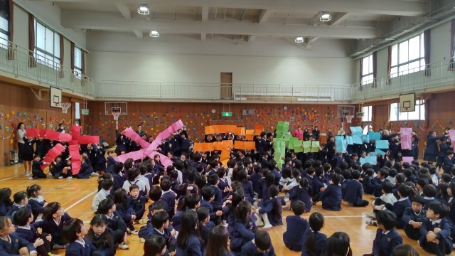 児童集会がありました。高学年の担当者が、単語を言うと、その言葉のひらがな表記の文字数と同じ人数が集まって座るというゲームをしていました。