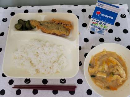 今日の献立は、いわしのフライ、みそ汁、きゅうりの赤じそあえ、ごはん、牛乳です。