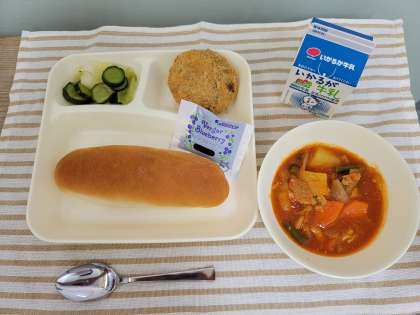 今日の献立は、フライドチキン、カレーシチュー、おいわいピクルス、フルーツゼリー、黒糖パン、牛乳です。