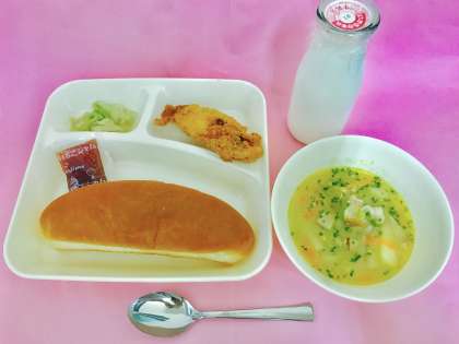 【サーモンフライ、コーンスープ、キャベツのソテー、大型コッペパン、牛乳】