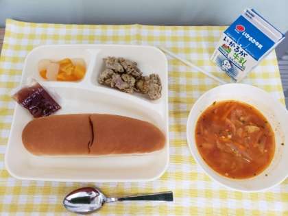 今日の献立は、豚肉のカレー風味焼き、ミネストローネ、ミックスフルーツ(缶)、大型コッペパン、牛乳です。