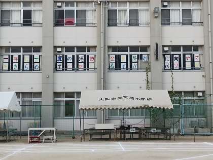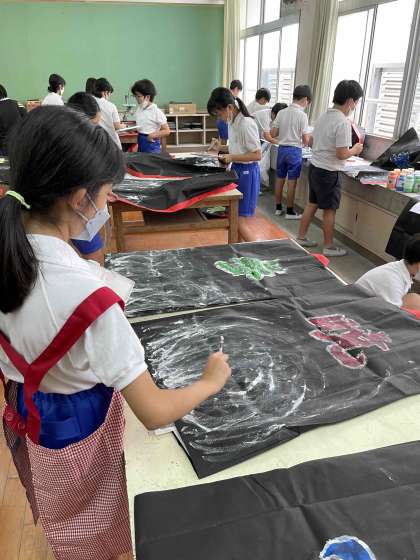 運動会のソーラン節で着るはっぴづくりをしました。自分のお気に入りの一字を選び、白の絵の具で波を書いて仕上げました。選んだ字がかっこよく映るようにみんな真剣に取り組んでいました。