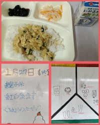 本日の給食は   ・親子丼   ・紅白なます   ・黒豆の煮もの    でした。...