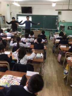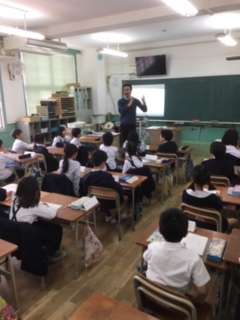 今年度、C-NETのモハメッド アルサワディ先生から英語を学びます。今日は3年生が「Hello! I'm〜.」や「I like〜.」などの使い方を、ジェスチャーを交えながらサワディ先生と楽しく学びました。