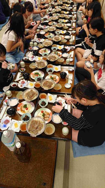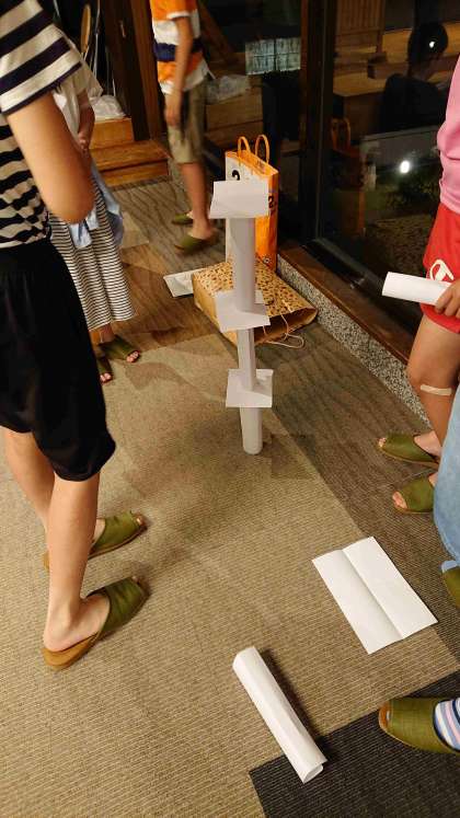 夜はレクリエーションの時間です。「班で協力して、紙をできるだけ高く積み上げてください。」というゲームでは、みんなでアイデアを出しあっていました。