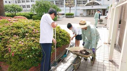 正門付近の側溝の泥あげをしたり、3年生がマリーゴールドの種を植えるのを手伝ったりしました。また休み時間には、子どもたちと一緒に遊ぶ場面も見られました。