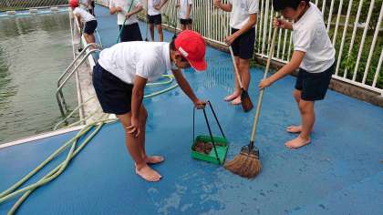 使わなかった間にたまったごみを掃いたり、プールサイドの汚れをゴシゴシとこすったりしました。