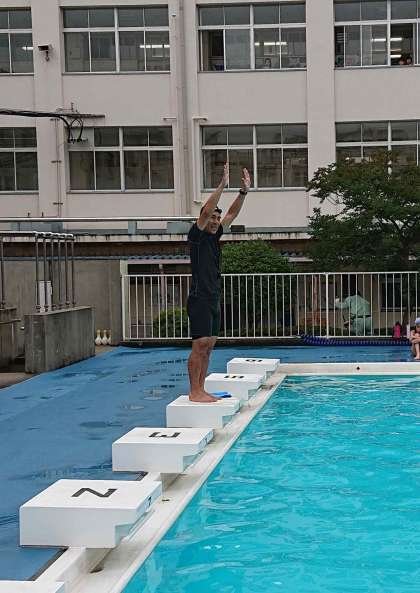 柴島中学校の体育科の先生に来ていただいて、クロールや平泳ぎなどの泳ぎ方について指導していただきました。
