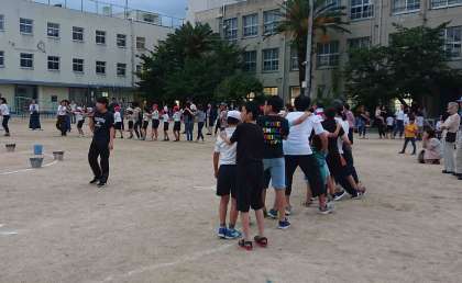 夜のレクリエーションです。校庭には地域の方々や他の学年の人たちも集まって、担任の先生の進行で、「白くまのジェンカ」の歌に合わせてダンスをしながらつながったり、「あんたがたどこさ」を歌いながら肩をたたき合ったりして、楽しい時間を過ごしました。