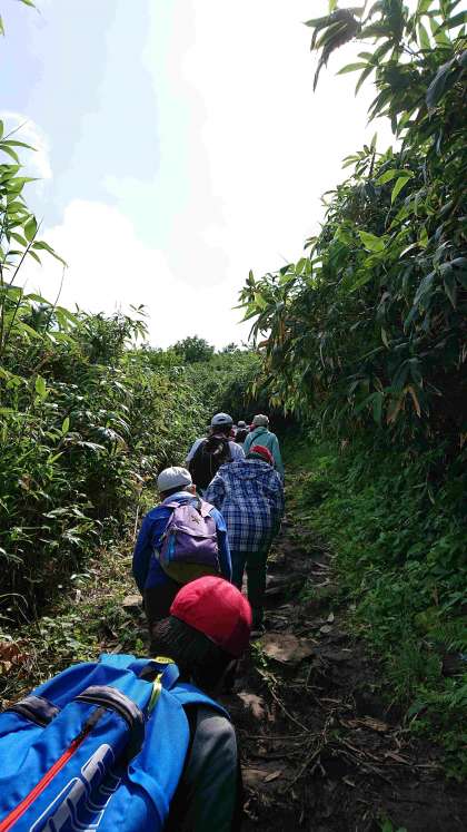 日頃山歩きを経験していない人たちは、登り始めてすぐに、「あ〜、もう無理。」「歩かれへん。」と座り込む姿も見られました。その度に、みんなで「行こう。」「がんばろう。」と声をかけあって登っていました。