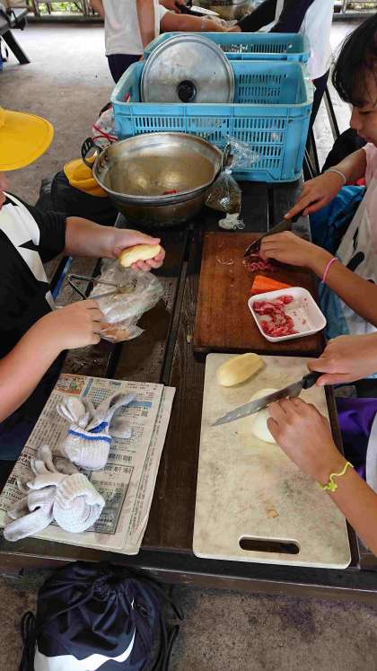 野菜を切ったり、かまどに火を起こしたり、みんなで分担して頑張っています。