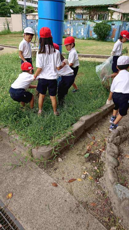 今日は全校のみんなで、校庭の除草を行いました。