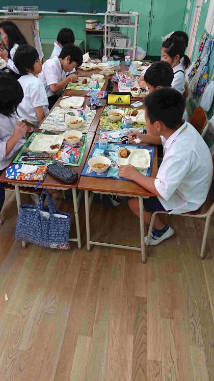 クラスの半分の人が、相手の学年の教室に移動しました。「すきなおかずは何?」「野菜いため!」などと話をしながら食べていました。6年生が、1年生に優しいまなざしを向けている姿がとても素敵でした。