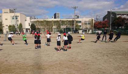 4時間目は2組同士、運動で交流しました。キッズチームごとにローテーションしながら、綱引き、おにごっこ、ドッヂボールの3種類の運動を楽しみました。