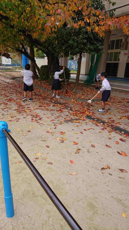 そうじの時間、子どもたちは落ち葉の掃き掃除に一生懸命です。