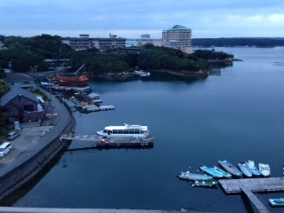 朝の会と朝食の様子、そして賢島の朝の風景です。