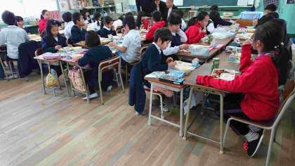 そして給食の時間。3年生以上の教室に、3〜4人ずつに分かれて入ってもらいました。子どもたちは、このときまで、あいさつの言葉などについて図書の本を借りたり自主学習で調べたりと、少しでもコミュニケーションをしようと準備をしてくれていて、紙やノートを見ながら、少し照れながらも一生懸命話しかけていました。