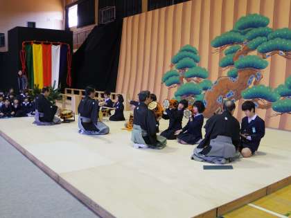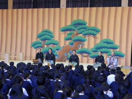 五人囃子の紹介に始まり、曲目「柿山伏」を鑑賞し、それぞれの楽器演奏のワークショップを行っていただきました。最後に「附子(ぶす)」の鑑賞を行いました。