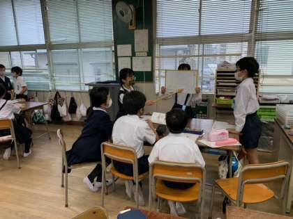 5年生は、4年生に分かりやすく伝えるにはどうすればよいかを考えて発表し、4年生は真剣に発表を聞くことができました。