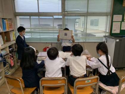 5年生は国語科の「和の文化を受けつぐ」で、文章と図表を結び付けて、わかりやすく説明するにはどうすればよいか学習をしました。学習したことを生かして、それぞれのグループで和の文化(和紙・花火・漬物・そば・団子・家・寿司・風呂敷・和服)について本で調べ、4年生に向けて発表会を行いました。