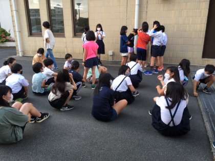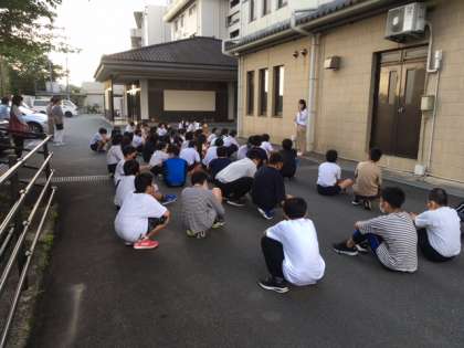 朝の集いです。部屋ごとに担任の先生に、健康状態を報告しています。