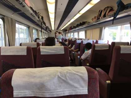 臨時特急発車待ちの車内のようすです。14:18出発で、学校には17:20ごろ到着の予定です。