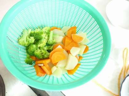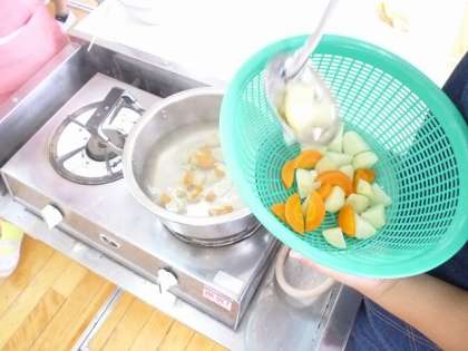 にんじん、じゃがいもは水から、早くゆで上がるように形も工夫する。