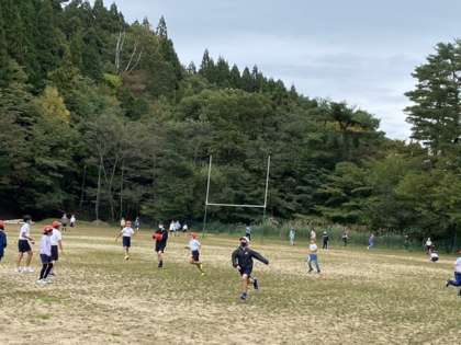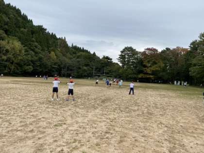 魚つかみと焼き板みがきの後は、クラス対抗おにごっこをしています。アスレチックは雨の後で使えなかったので、広いグラウンドでいっぱい遊んでいます。