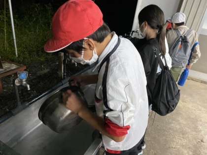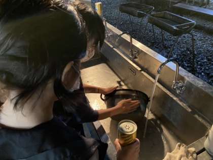 おいしく食べた後は、みんなで協力して片付けを頑張っています。鍋の焦げを取るのが大変です。