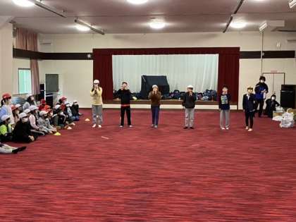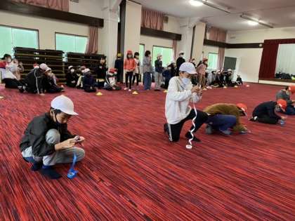 高丸山登山は雨のため、室内オリンピックを活動班で協力して楽しんでいます。1種目ストロー吹き矢ゲーム、2種目目紙テープ駅伝をしています。