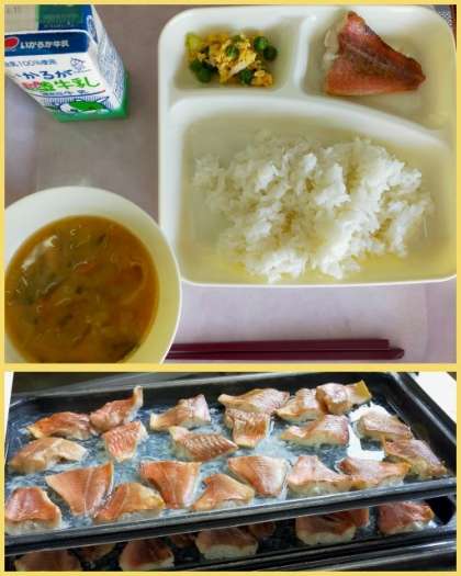 本日の給食は ・あかうおのしょうゆだれかけ