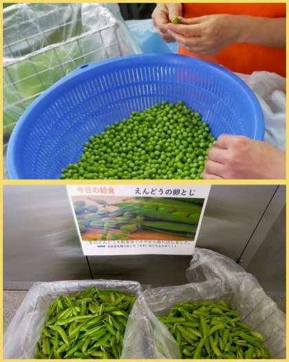給食調理員さんに朝から時間をかけて生のえんどうを「さや」から取り出してもらい