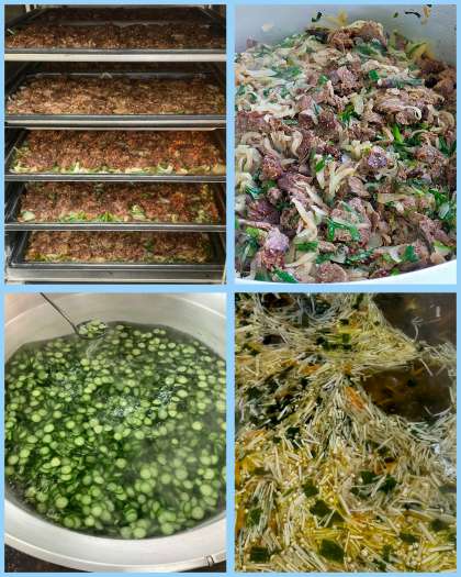 牛肉に、しょうが汁、すりおろしたにんにく、コチジャン、すりごまなどで下味をつけ、たまねぎとにらを混ぜ合わせて、焼き物機で焼いています。