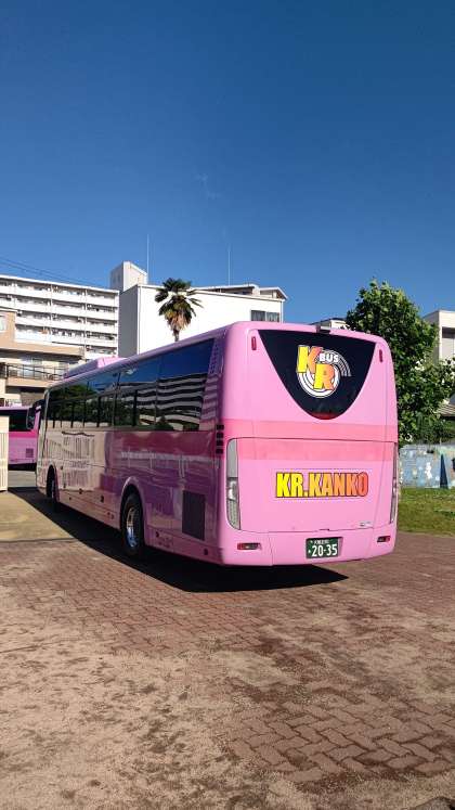 快晴のもと、ピンクのバスで陽気に出発です!たくさんのお見送りありがとうございます。