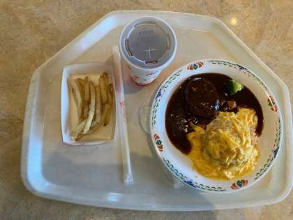 店でスクールメニューを注文して食べます。これはハンバーグオムライスセットです。