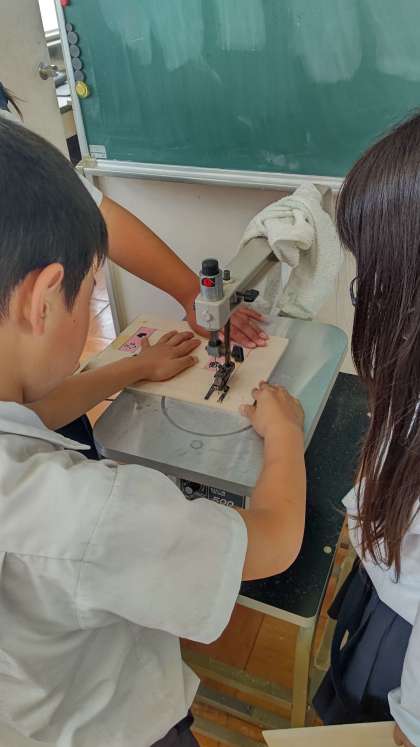 ホワイトボードを制作しています。ちょっとこわい初めて使う電動糸のこ。友だち同士で助け合って、挑戦しています。出来上がりが楽しみです!