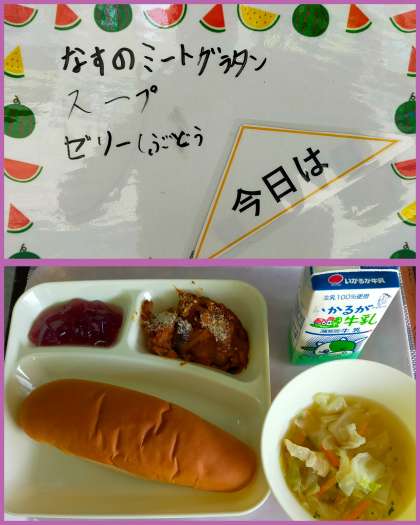 「なすのミートグラタン」は、なすをひき肉、マカロニ、たまねぎとともにケチャップ味のグラタンです。なすが苦手な児童にも食べやすい献立で、粉末チーズを使用していないので、乳アレルギーの児童も食べることができます。