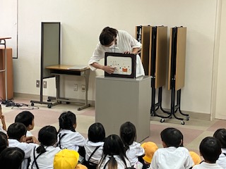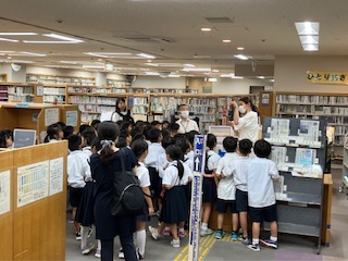 東淀川図書館での本の借り方、返し方を教えていただきました。図書館についての紙芝居も見せていただき、最後に実際に本を選んで読みました。