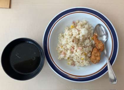 登山と高原でのおやつタイムの後の昼食はピラフと唐揚げです。