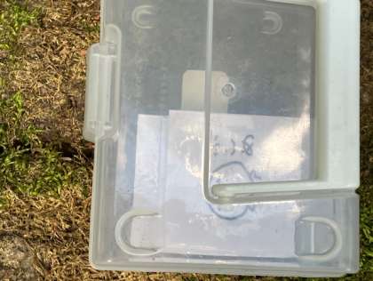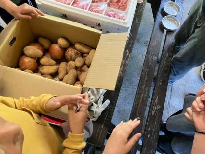 地図上の6か所に宝箱があるとの説明を受け,制限時間30分で、班ごとに協力して宝を探しました。透明のボックスの中には食材(写真は「おこめ」)のカードがあり、それをとります。結局、全班とも6枚のお宝カードを無事獲得し、宿舎の方に、カードと食材を交換していただきました。