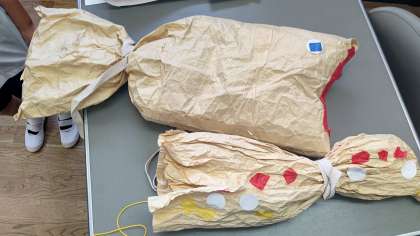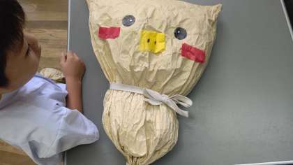 図工で、袋をくしゃくしゃにして、ぎゅっとして、素敵な作品を作っています。さめに、電車に、ぶたに、と色々な作品がどんどん出来ています。みんなとってもうれしそうに、だっこしたり、動かしたり。おうちに持ち帰ったら、たくさんお話を聞いてあげてください。