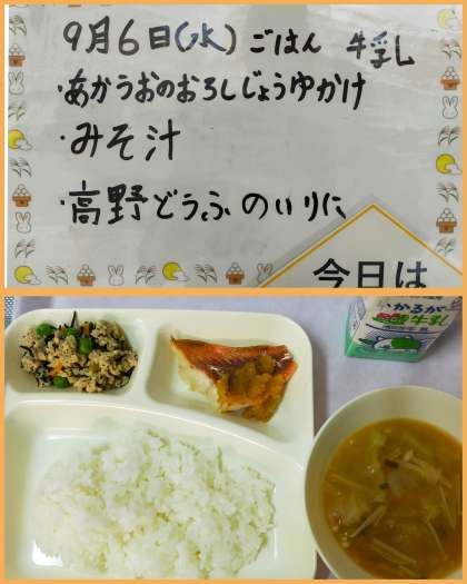 本日の給食は ・あかうおのおろしじょうゆかけ