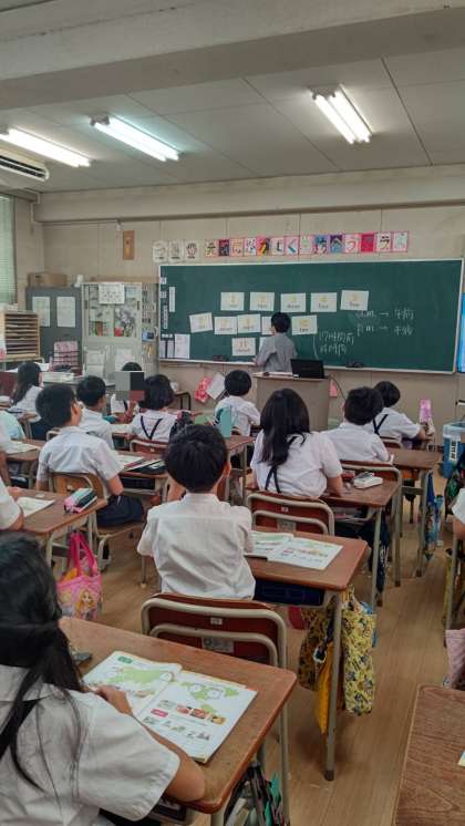 東淡路小学校では、柴島中学校の英語の先生が、外国語活動の授業をしてくださいます。今日はWhat's time is it now?