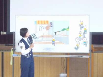 児童向けのわかりやすいDVDを視聴した後、警察官の方が、ご自身の