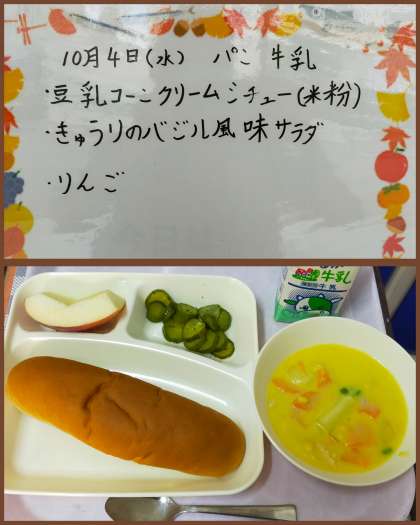 本日の給食は ・豆乳コーンクリームシチュー(米粉)