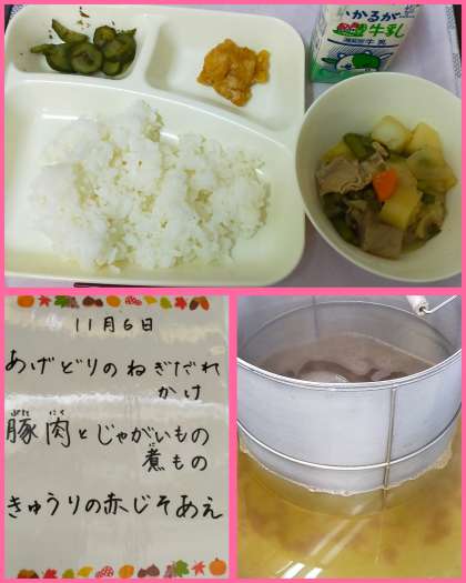 児童が大好物のカラッと揚がったあげどりに、あっさりとしたねぎだれが絡まり、本日は鶏肉のサイズが大きく、一人分が一〜二個でした。