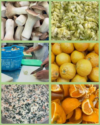 給食に登場するかんきつ類は、あまなつかん、いよかん、オレンジ、かわちばんかん、デコポン、はっさく、みかん、ゆず、レモンの9種類です。ゆずとレモンは果汁をあえたものなどに使用しています。